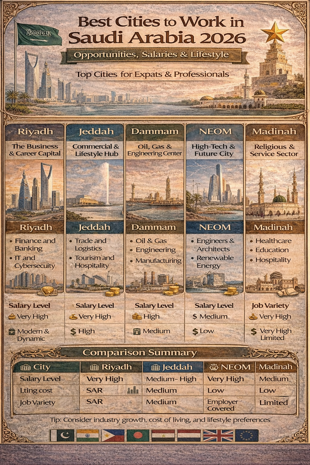 The best cities to work in Saudi Arabia in 2026 offer diverse opportunities depending on your career path. Riyadh leads in salaries and growth, Jeddah balances work and lifestyle, Dammam suits engineers, and NEOM attracts future-focused professionals.