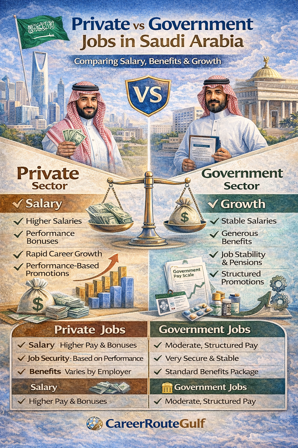 Choosing between private vs government jobs in Saudi Arabia is one of the most important career decisions for professionals planning to work in the Gulf. Both sectors offer unique advantages, but they differ significantly in salary structure, work culture, job stability, and long-term growth.