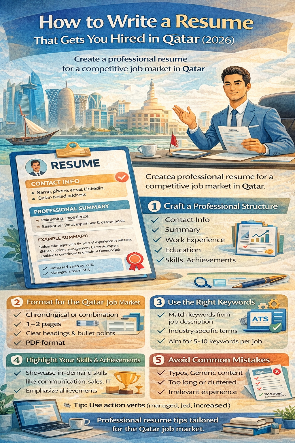 - Contact Information: Name, phone, email, LinkedIn, city (Qatar-based if possible)