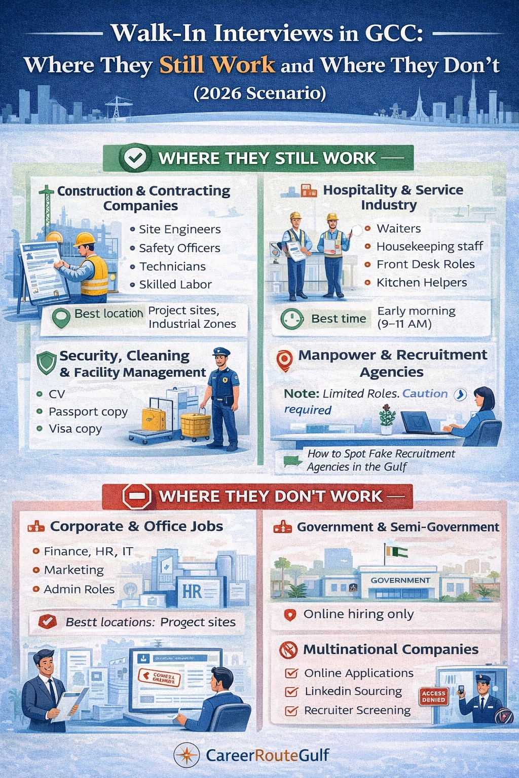 Walk-in interviews in GCC are not dead, but they are no longer universal. In 2026, they work best in specific industries and fail in corporate hiring. Knowing where to apply your effort saves time and increases success.